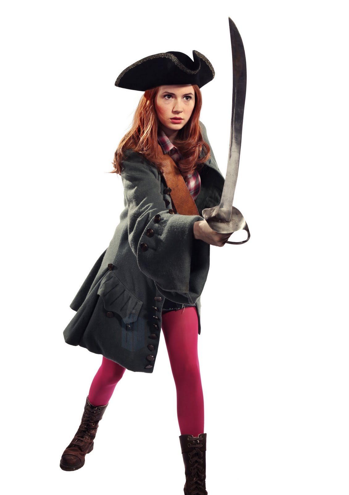 She's holding a sword and wearing a pirate coat and hat, along with a miniskirt and pinkish-red tights.